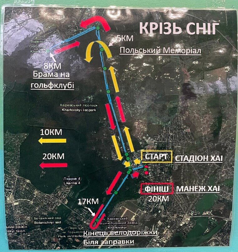 МАРШРУТ: Стадіон ХАІ (старт) - Польський меморіал (5км) – Брама на Гольфклубі (8км) – Харківський Лісопарк (10 км) – Кінець велодоріжки (17км) – Спортивний манеж ХАІ (20км, фініш).