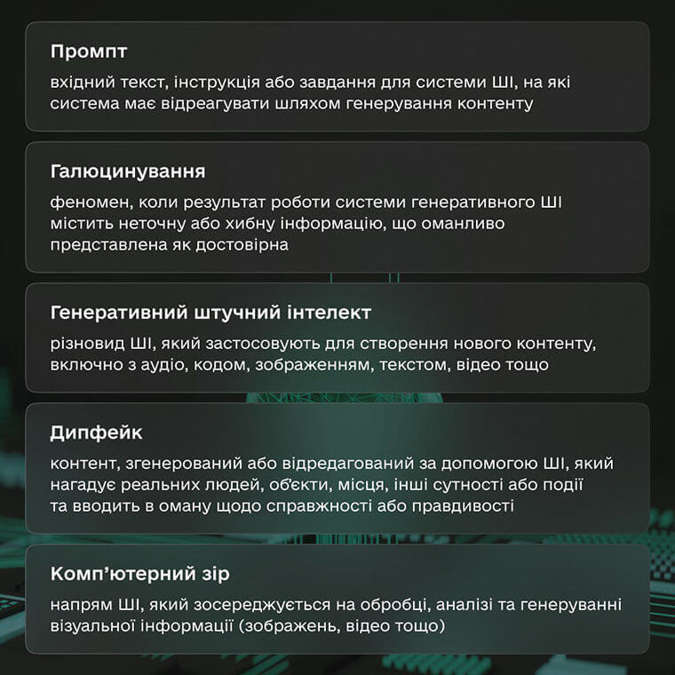 Галюцинування, дипфейк і промпт. Знайомтеся зі словником термінів зі штучного інтелекту. Зібрали найпопулярніші слова й словосполучення та розробили словник термінів із ШІ, щоб українці вільно говорили про інновації. Повний список шукайте за посиланням.