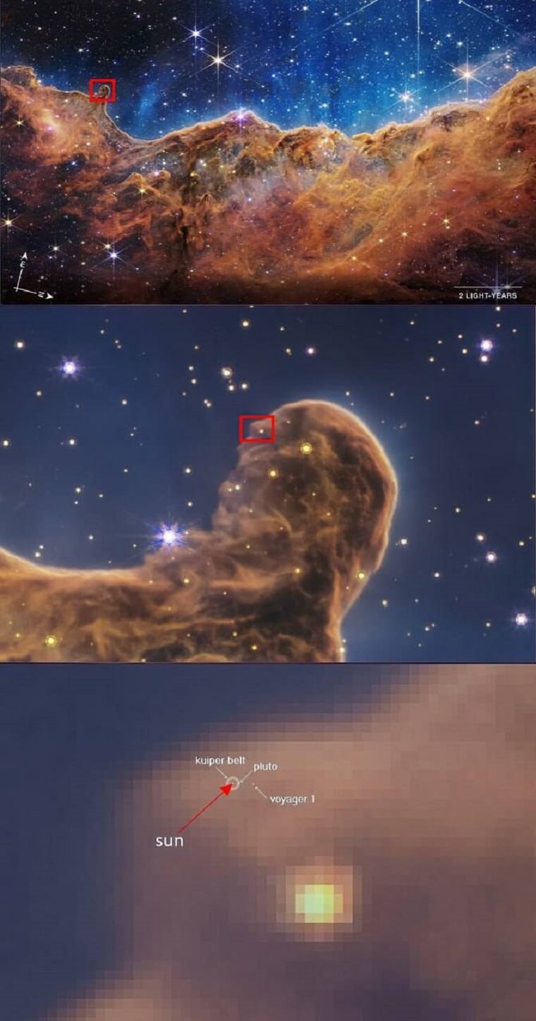 Якби ми помістили Сонячну систему всередину цієї гігантської хмари газу та пилу — вона просто розчинилася б, стала б непомітною, мов піщинка у пустелі.