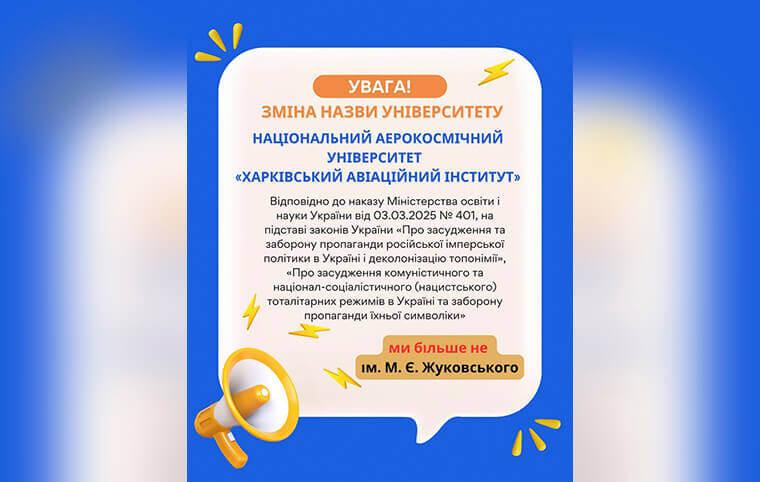 Відповідно до наказу Міністерства освіти і науки України від 03.03.2025 № 401, на підставі законів України «Про засудження та заборону пропаганди російської імперської політики в Україні і деколонізацію топонімії», «Про засудження комуністичного та націонал-соціалістичного (нацистського) тоталітарних режимів в Україні та заборону пропаганди їхньої символіки», наш заклад вищої освіти змінює свою назву з Національного аерокосмічного університету ім. М. Є. Жуковського «Харківський авіаційний інститут» на Національний аерокосмічний університет «Харківський авіаційний інститут».