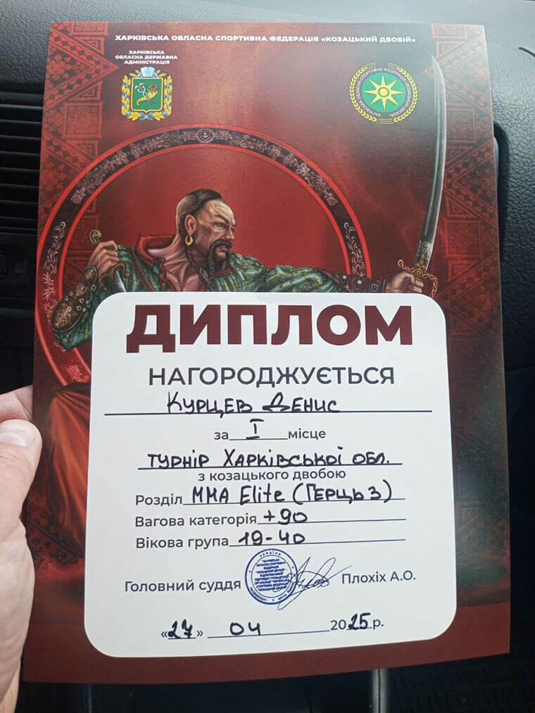 Вітаємо оплесками нашого Чемпіона – завідувача лабораторії кафедри фізичного виховання, спорту та реабілітації (705) Дениса КУРЦЕВА, який виборов перше місце у розділі MMA Elite – Герць 3 на обласному турнірі Харківської області з козацького двобою.