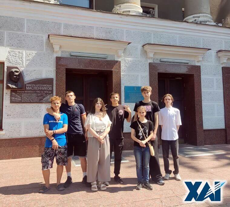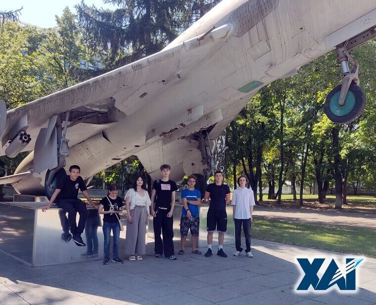 На фото — 8 серпня майбутні студенти кафедри нарисної геометрії та комп’ютерного моделювання не тільки вперше зібралися групою, а й вирушили у веселу екскурсію територією ХАІ. Пам’ятник «Шарі», Су-7Б, яблука на алеях Літакобудівного корпусу…