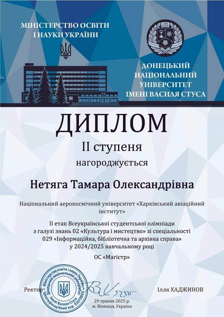 Учора, під час засідання ректорату, пролунали щирі оплески та вітальні слова: в.о. ректора Олексій Литвинов особисто вручив диплом переможниці ІІ етапу Всеукраїнської студентської олімпіади зі спеціальності 029 "Інформаційна, бібліотечна та архівна справа" — Тамарі Нетязі, магістрантці кафедри документознавства та української мови.