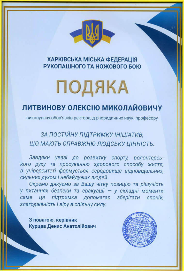 Окрім цього, Денис КУРЦЕВ - чемпіон світу з кемпо-карате та з рукопашного бою, срібний призер чемпіонату світу з козацького двобою - передав виконуючому обов’язки ректора ХАІ Олексію ЛИТВИНОВУ подяку від Харківської міської федерації рукопашного та ножового бою.