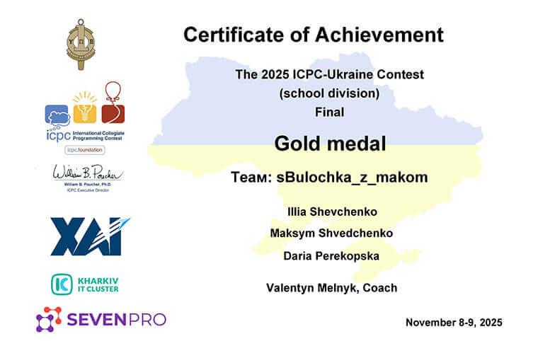 Під керівництвом доцента кафедри інженерії програмного забезпечення (№ 603) Ілони ШЕВЧЕНКО було проведено фінальний етап шкільного дивізіону Всеукраїнської студентської командної олімпіади з програмування ICPC-Ukraine-2025, який відбувся 8–9 листопада 2025 р.
