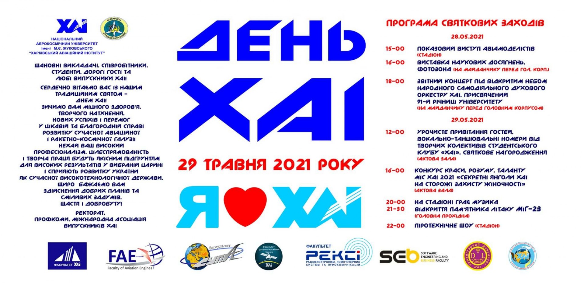 28-29 травня 2021 року (можливі зміни проведення у зв’язку із обмежувальними заходами продовження карантину та погодних умов) Національний аерокосмічний університет ім. М. Є. Жуковського «Харківський авіаційний інститут» буде святкувати 91 рік від дня заснування!