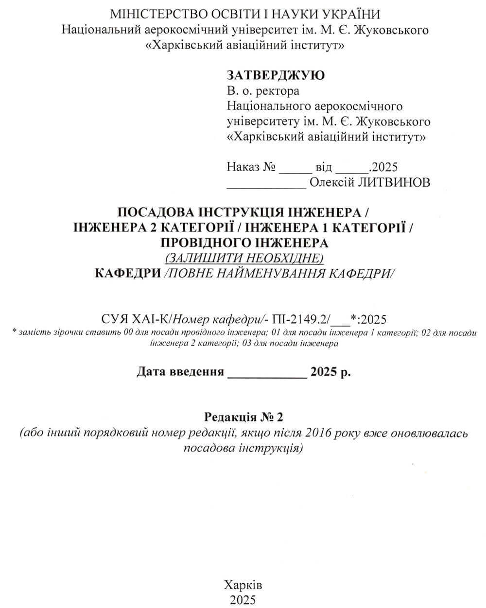 Текст повинно бути надруковано однаковим шрифтом (замість тексту з курсивом вказувати актуальні для посади інженера / інженера 2 категорії / інженера 1 категорії / провідного інженера відповідної кафедри відомості), розробником документу вказувати завідувача лабораторії (якщо цієї посади немає у штатному розписі, зазначати завідувача кафедри), особою, хто перевіряє, вказувати завідувача кафедри (якщо у штатному розписі кафедри немає посади завідувача лабораторії та розробником зазначено завідувача кафедри, особою, хто перевіряє, зазначати декана факультету). У колонтитулах до документу реквізити системи управління якістю вказувати як «СУЯ ХАІ-К/номер кафедри/-ПІ-2149.2/___*:2025». Зразок титульного аркушу посадової інструкції інженера наведено у Додатку А до цієї Типової посадової інструкції.