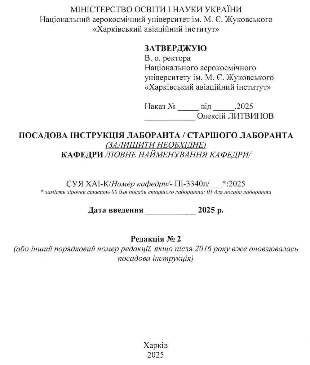 Текст повинно бути надруковано однаковим шрифтом (замість тексту з курсивом вказувати актуальні для посади лаборанта / старшого лаборанта відповідної кафедри відомості), розробником документу вказувати завідувача лабораторії (якщо цієї посади немає у штатному розписі, зазначати завідувача кафедри), особою, хто перевіряє, вказувати завідувача кафедри (якщо у штатному розписі кафедри немає посади завідувача лабораторії та розробником зазначено завідувача кафедри, особою, хто перевіряє зазначати декана факультету). У колонтитулах до документу реквізити системи управління якістю вказувати як «СУЯ ХАІ-К/номер кафедри/-ПІ-3340л/___*:2025». Зразок титульного аркушу посадової інструкції лаборанта / старшого лаборанта наведено у Додатку А до цієї Типової посадової інструкції.