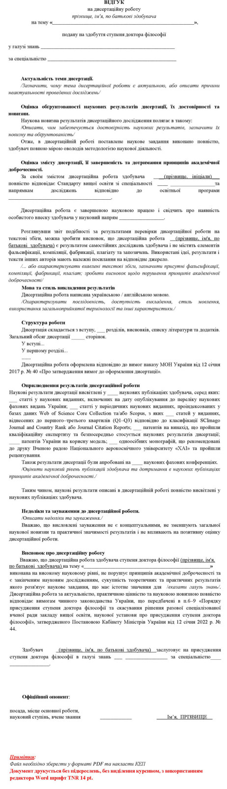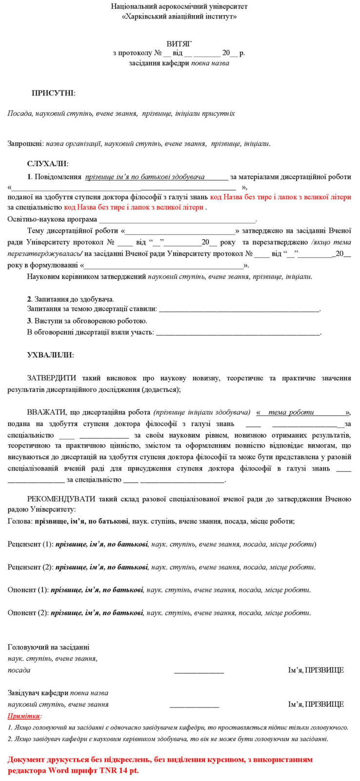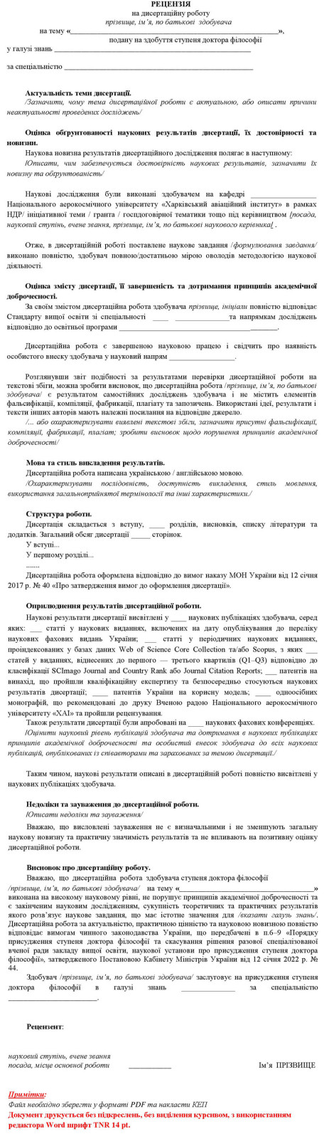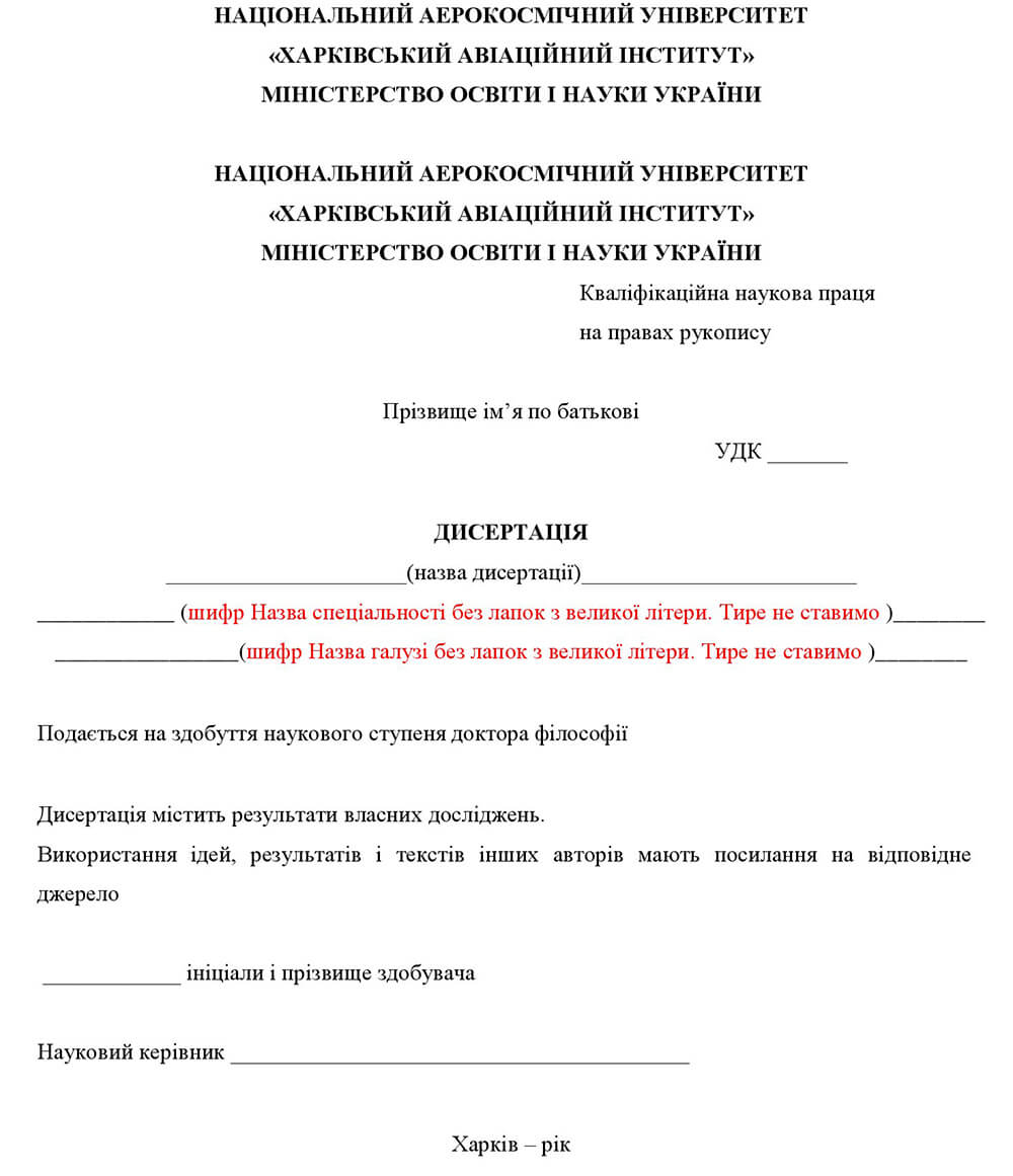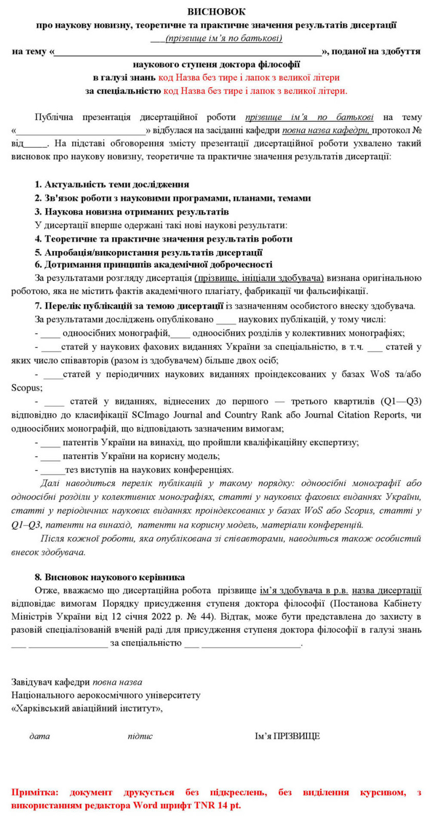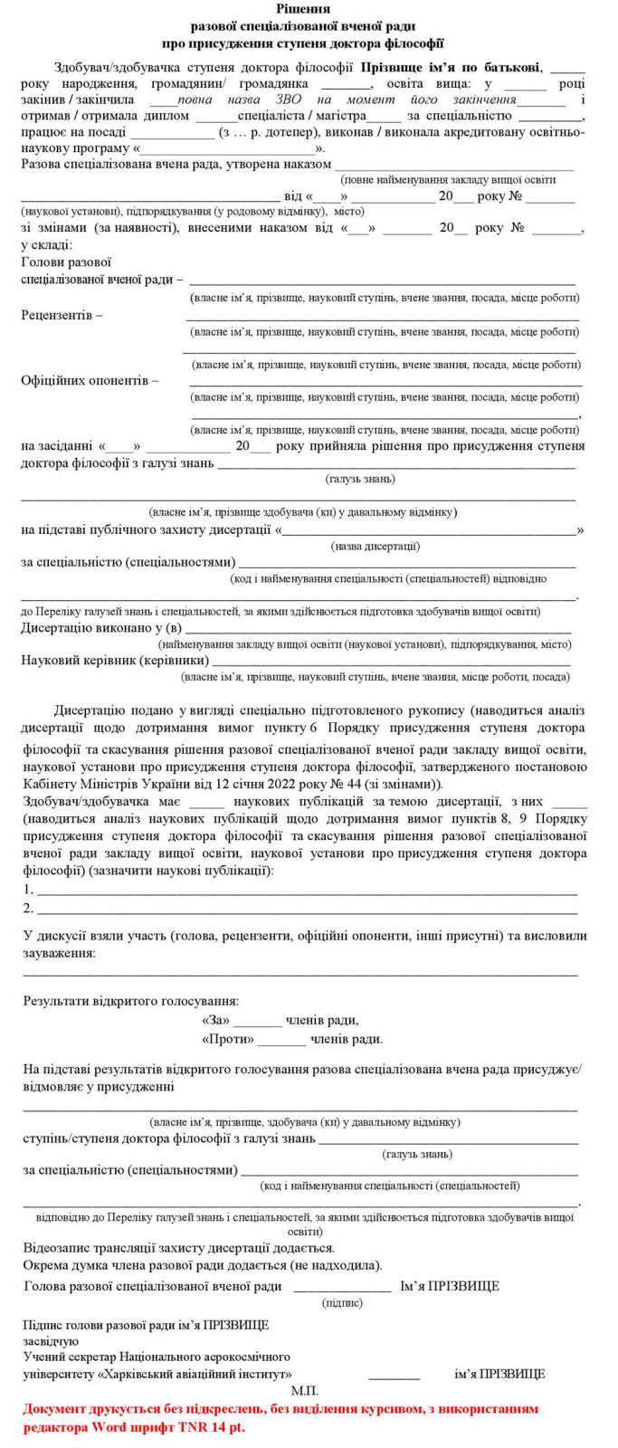 1.1. Це положення про порядок присудження ступеня доктора філософії та проходження процедури захисту дисертації на здобуття ступеня доктора філософії у Національному аерокосмічному університеті «Харківський авіаційний інститут» (далі – Положення) розроблено на підставі Закону України «Про вищу освіту» від 01.07.2014 р. № 1556-VII, Порядку підготовки здобувачів вищої освіти ступеня доктора філософії та доктора наук у закладах вищої освіти (наукових установах), затвердженого постановою Кабінету Міністрів України від 23.03.2016 № 261 в редакції постанови Кабінету Міністрів України від 19 травня 2023 р. № 502, Порядку присудження ступеня доктора філософії та скасування рішення разової спеціалізованої вченої ради закладу вищої освіти, наукової установи про присудження ступеня доктора філософії», затвердженого постановою Кабінету Міністрів України від 12.01.2022 № 44 в редакції від 08.05.2024(далі – Порядок), Порядку функціонування інформаційної системи Національного агентства із забезпечення якості вищої освіти (далі НАЗЯВО) «NAQA.Svr», затвердженого НАЗЯВО, протокол від 30 серпня 2022 року № 13 (18) зі змінами (протокол від 19 листопада 2024 року № 19 (69), протокол від 22 квітня 2025 року № 6 (78), «Порядку державного обліку НТР та дисертацій. Роз'яснення щодо державної реєстрації та обліку відкритих науково-дослідних, дослідно-конструкторських робіт / Державна наукова установа «Український інститут наукової експертизи та інформації», постанови Кабінету Міністрів України «Про внесення змін до деяких постанов Кабінету Міністрів України з питань підготовки та атестації здобувачів наукових ступенів» від 19.05.2023 № 502, постанови Кабінету Міністрів України «Про внесення змін до деяких постанов Кабінету Міністрів України з питань підготовки та атестації науково-педагогічних і наукових кадрів» № 507 від 03.05.2024, листа-роз’яснення щодо застосування кваліфікованих електронних підписів при створенні разових рад Національного агентства із забезпечення якості вищої освіти від 07.07.2023 № 918.