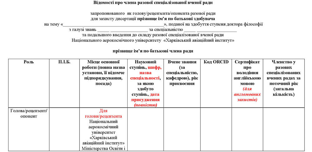 - зведена інформація про дисертацію, наукові публікації та склад разової ради, сформованої відповідно до п. 4.4 цього Положення, для внесення даних до ІС НАЗЯВО та УкрІНТЕІ (Додаток 2. Зразок 8).