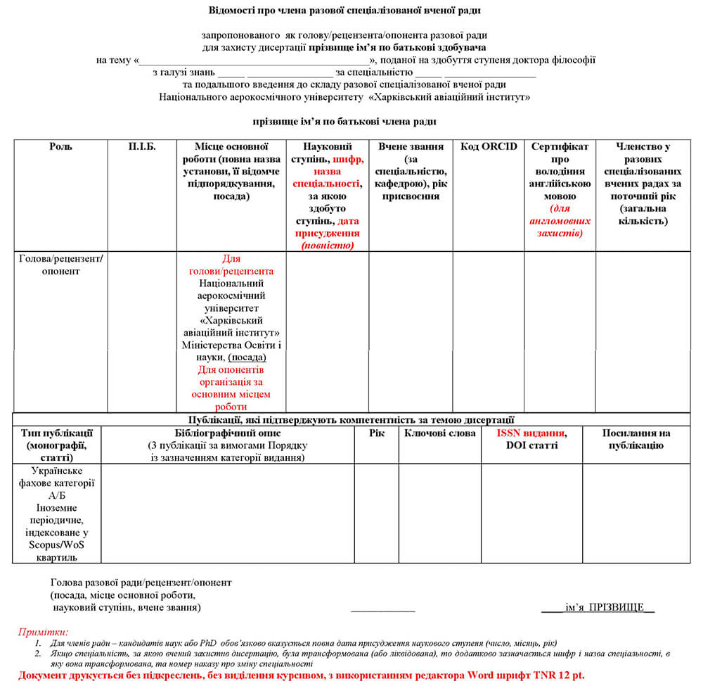- згоди передбачуваних офіційних опонентів на участь у роботі разової ради та відомості про них та їхні наукові публікації, що підтверджують компетентність науковця за темою дисертації;