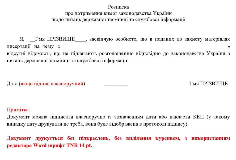 - розписка Здобувача про дотримання вимог законодавства України щодо питань державної таємниці та службової інформації;