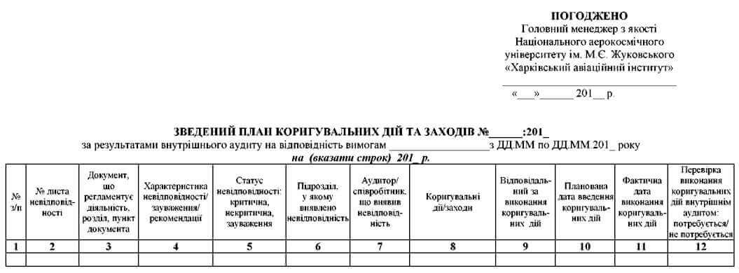 6) СУЯ ХАІ-НМВ-Ф.ВА/006 Форма зведеного плану коригувальних дій та заходів;
