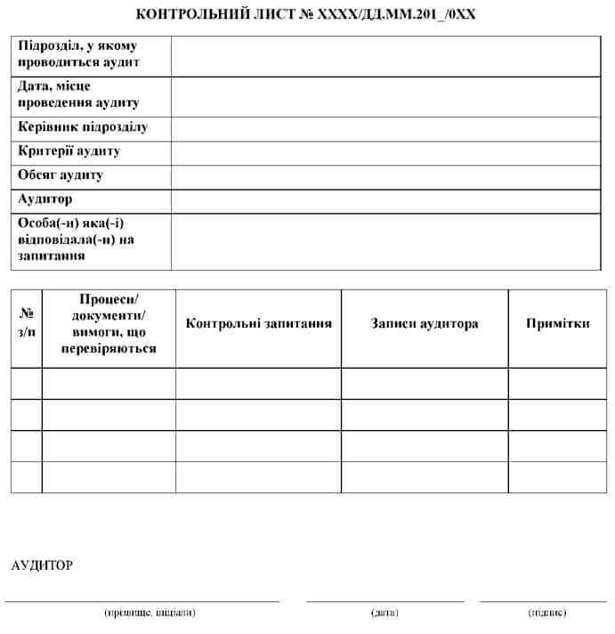 Контрольний лист оформлюється за формою, наведеною у додатку Г, й якому присвоюється ідентифікаційний номер, що складається зі скороченої назви відділу, у якому буду проводитися аудит, дати проведення аудиту й порядкового номера.