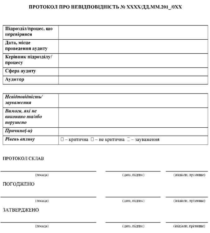 Протокол про невідповідність оформлюється за формою, наведеною у додатку Д, й якому присвоюється ідентифікаційний номер, що складається зі скороченої назви відділу, у якому було виявлено невідповідність, дати проведення аудиту й порядкового номеру.