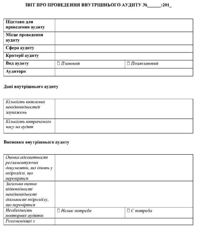 Примітка. Залежно від цілей і обсягу аудиту форму звіту про проведення внутрішнього аудиту може бути доповнено додатковою інформацією.
