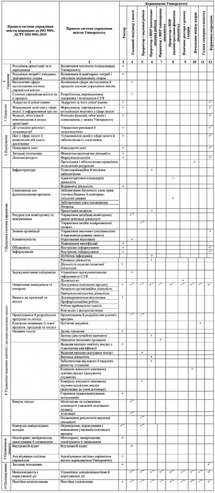 Розподіл відповідальності за процеси системи управління якістю Університету