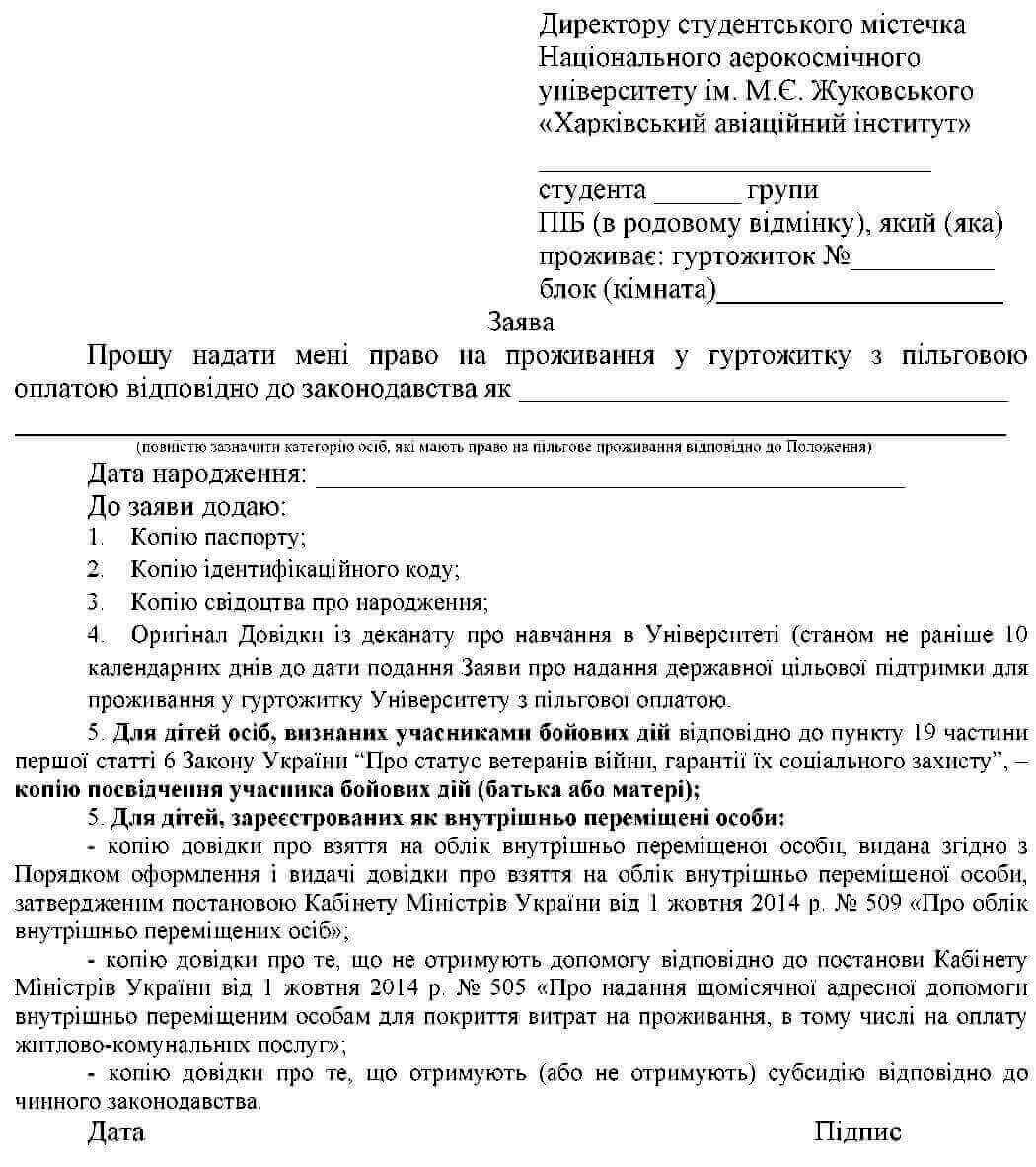 Зразок заяви для надання державної цільової підтримки деяким категоріям громадян, пов’язаної з проживанням у студентському гуртожитку, у вигляді надання права на проживання у гуртожитку з пільговою оплатою