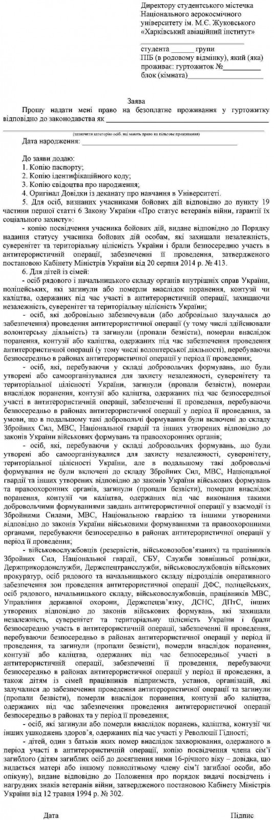 Зразок заяви для надання державної цільової підтримки деяким категоріям громадян, пов’язаної з проживанням у студентському гуртожитку, у вигляді надання права на безоплатне проживання у гуртожитку