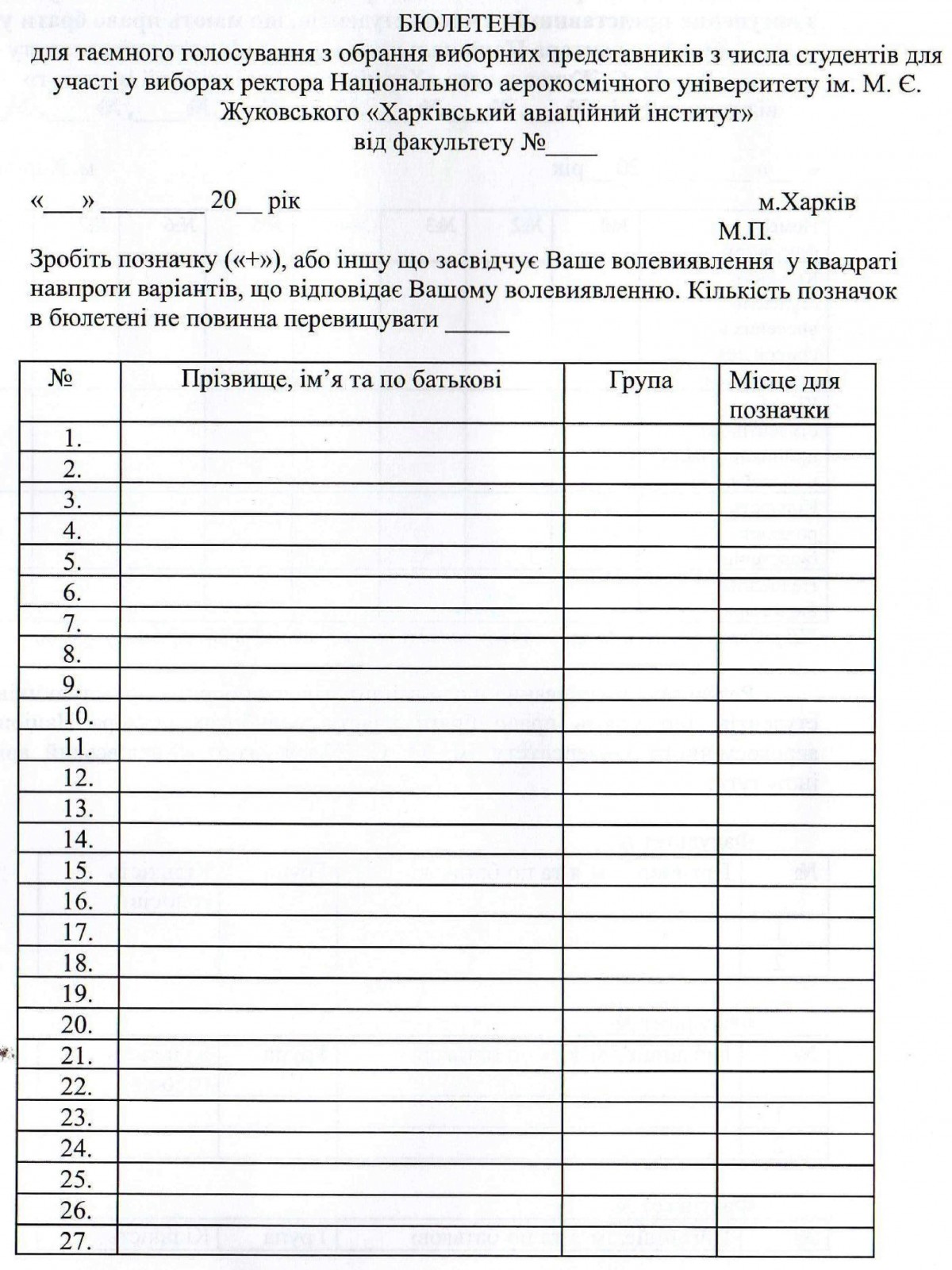 3.3.14 У бюлетені для голосування особа, яка бере участь у голосуванні, робить позначку («+»), або іншу що засвідчує її волевиявлення, у квадраті навпроти варіантів, що відповідає її волевиявленню («за» чи «проти»). Кількість позначок в бюлетені не повинна перевищувати кількості Представників від Факультету визначеною за формулою вказаною в пункті 2.2 цього Положення.