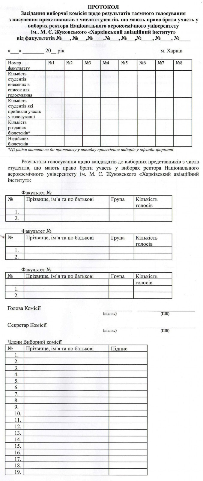 3.6.16 Перший примірник протоколу про результати голосування залишається Комісії. Другий примірник протоколу передається організаційному комітету з проведення виборів ректора Університету.