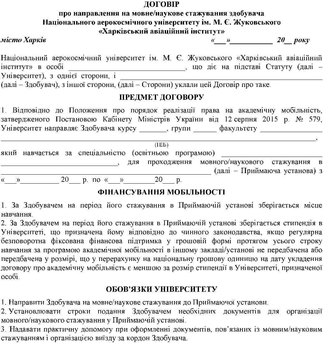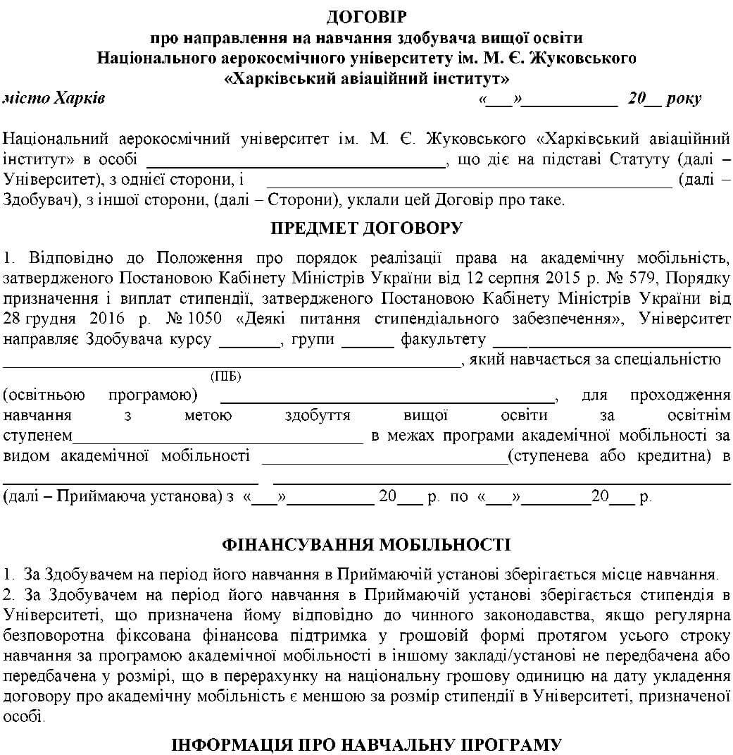 1.1 Положення про порядок реалізації права на академічну мобільність учасниками освітнього процесу (далі - Положення) Національного аерокосмічного університету «Харківський авіаційний інститут» (далі - Університет) розроблено відповідно до Закону України «Про вищу освіту», Положення про порядок реалізації права на академічну мобільність, затвердженого Постановою Кабінету Міністрів України від 12 серпня 2015 р. № 579, Порядку призначення і виплат стипендії, затвердженого Постановою Кабінету Міністрів України від 28 грудня 2016 р. № 1050 «Деякі питання стипендіального забезпечення» та інших нормативно-правових актів з питань вищої освіти, Статуту Університету, Положення про організацію освітнього процесу в Національному аерокосмічному університеті «Харківський авіаційний інститут».