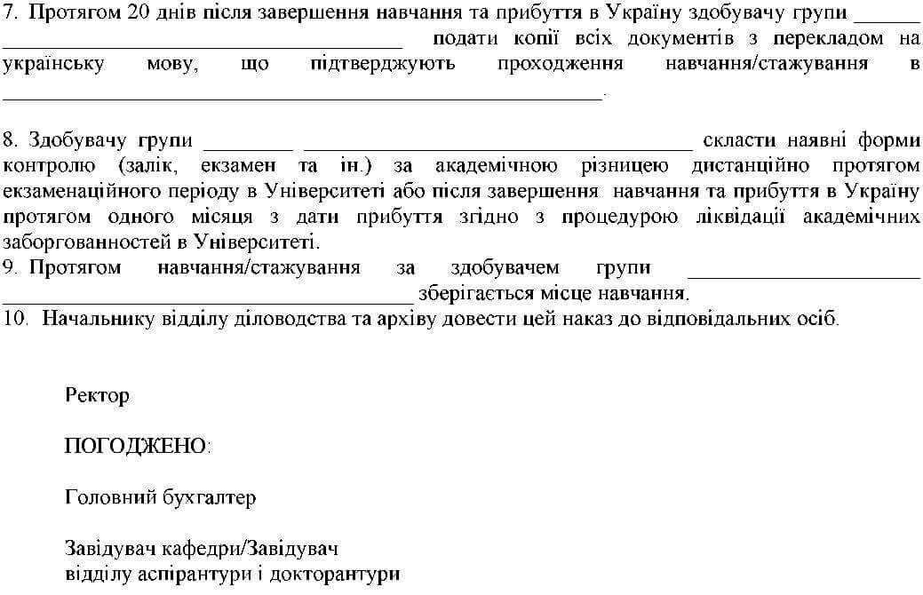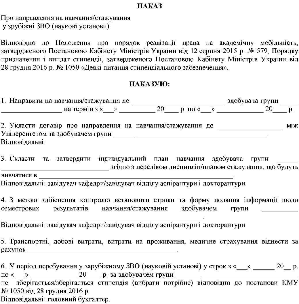 3) наказ про направлення учасника академічної мобільності до приймаючого ЗВО-партнера у межах програми академічної мобільності (складає департамент, відповідальний за програму академічної мобільності) (див. Додатки Г, Д).