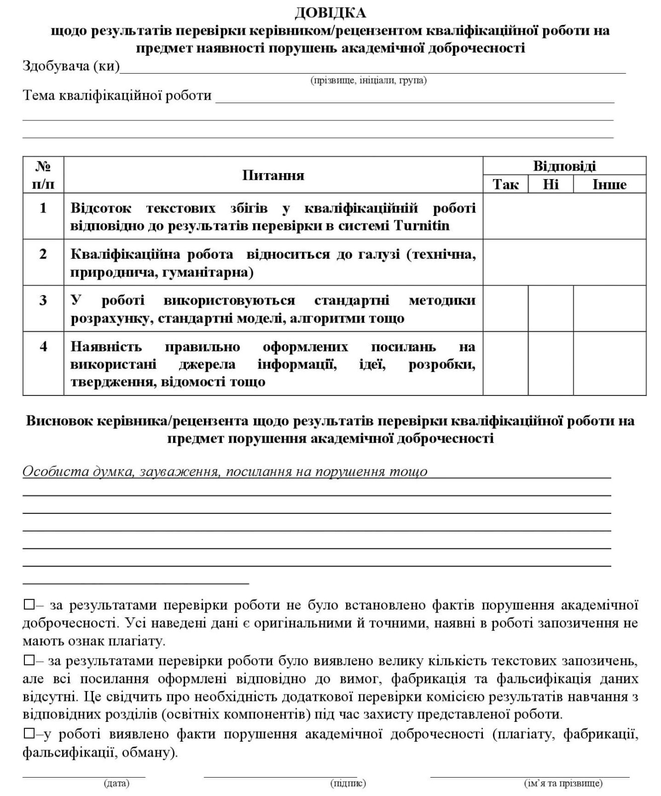 – довідка від керівника/рецензента щодо відсутності порушень академічної доброчесності з боку здобувача під час підготовки і виконання кваліфікаційної роботи;