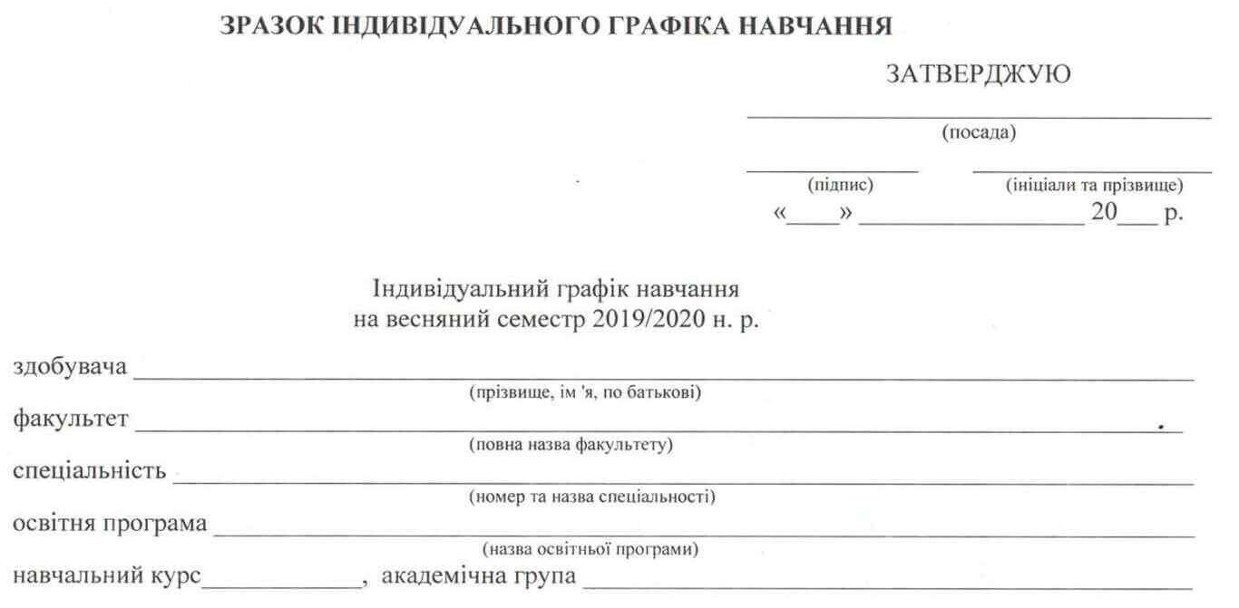 4.4 До індивідуального графіку навчання включаються усі навчальні дисципліни семестрового плану й індивідуальні завдання (курсові роботи, курсові проекти, реферати та інші види робіт), які здобувач вищої освіти має виконати, а також форми поточного й підсумкового контролю та терміни звітності. Графік підписують здобувач вищої освіти та декан факультету, затверджує проректор з науково-педагогічної роботи.
