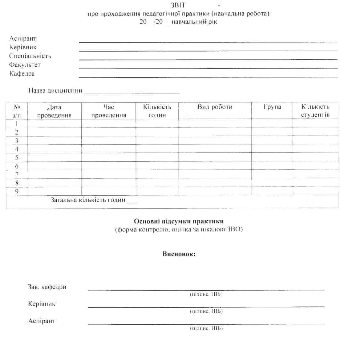 4.2 За підсумками проходження педагогічної практики аспірант подає до відділу аспірантури і докторантури звіт за кожним видом робіт педагогічної практики, підписаний завідувачем кафедри, науковим керівником або лектором з дисципліни, за якою відбувалася практика (додаток 1), (додаток 2).