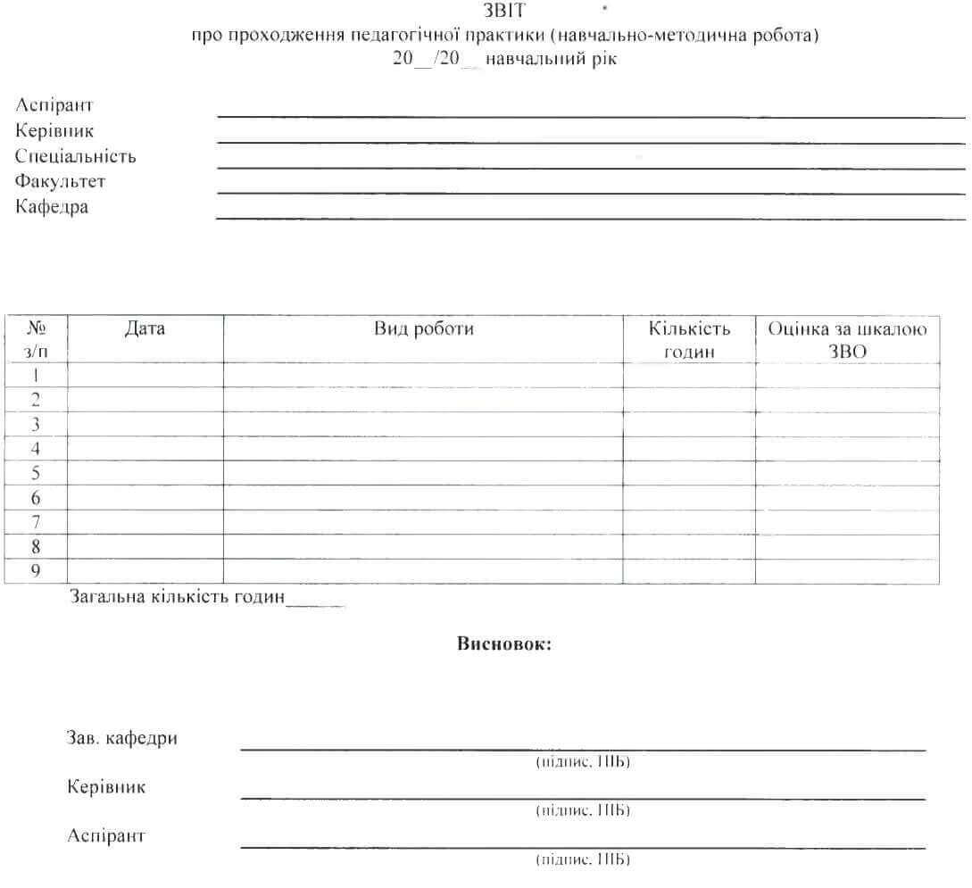 4.4 Аспіранти, які виконують навчальну, навчально-методичну роботу за трудовою угодою в межах Університету подають до аспірантури звіт про проходження педагогічної практики відповідно виконаної на кафедрі (Університету) навчальної, навчально-методичної роботи. Звіти мають бути підписані науковим керівником та завідувачем кафедри на якій виконує навантаження аспірант. Оцінка виставляється за результатами контролю окремих занять, які проводить аспірант, за планом завідувача кафедри.