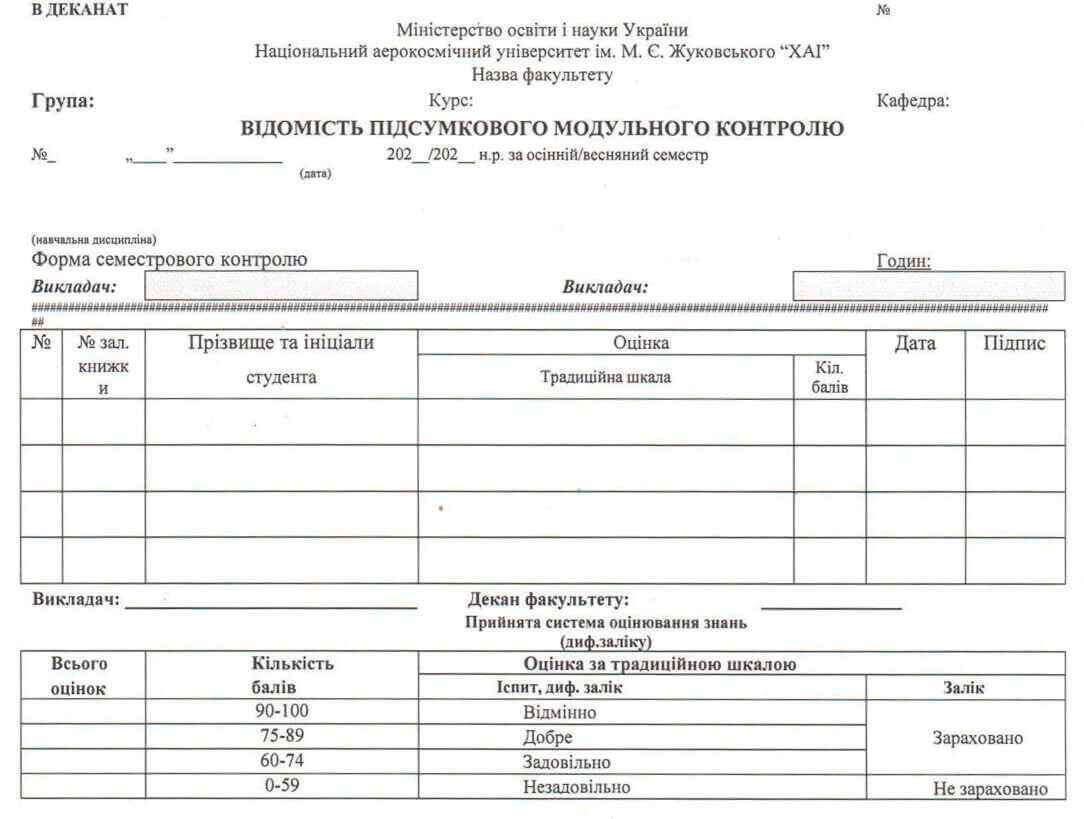 2.3.4. Електронна відомість підсумкового модульного контролю (Додаток А) формується співробітниками відділу якості освіти, аналітики та навчально- методичного забезпечення та розсилається до деканатів факультету. Співробітники деканатів розсилають електронні відомості на електронну пошту кафедр напередодні початку тижня підсумкового контролю, у яку вноситься підсумкова модульна оцінка або оцінка підсумкового (семестрового) контролю.