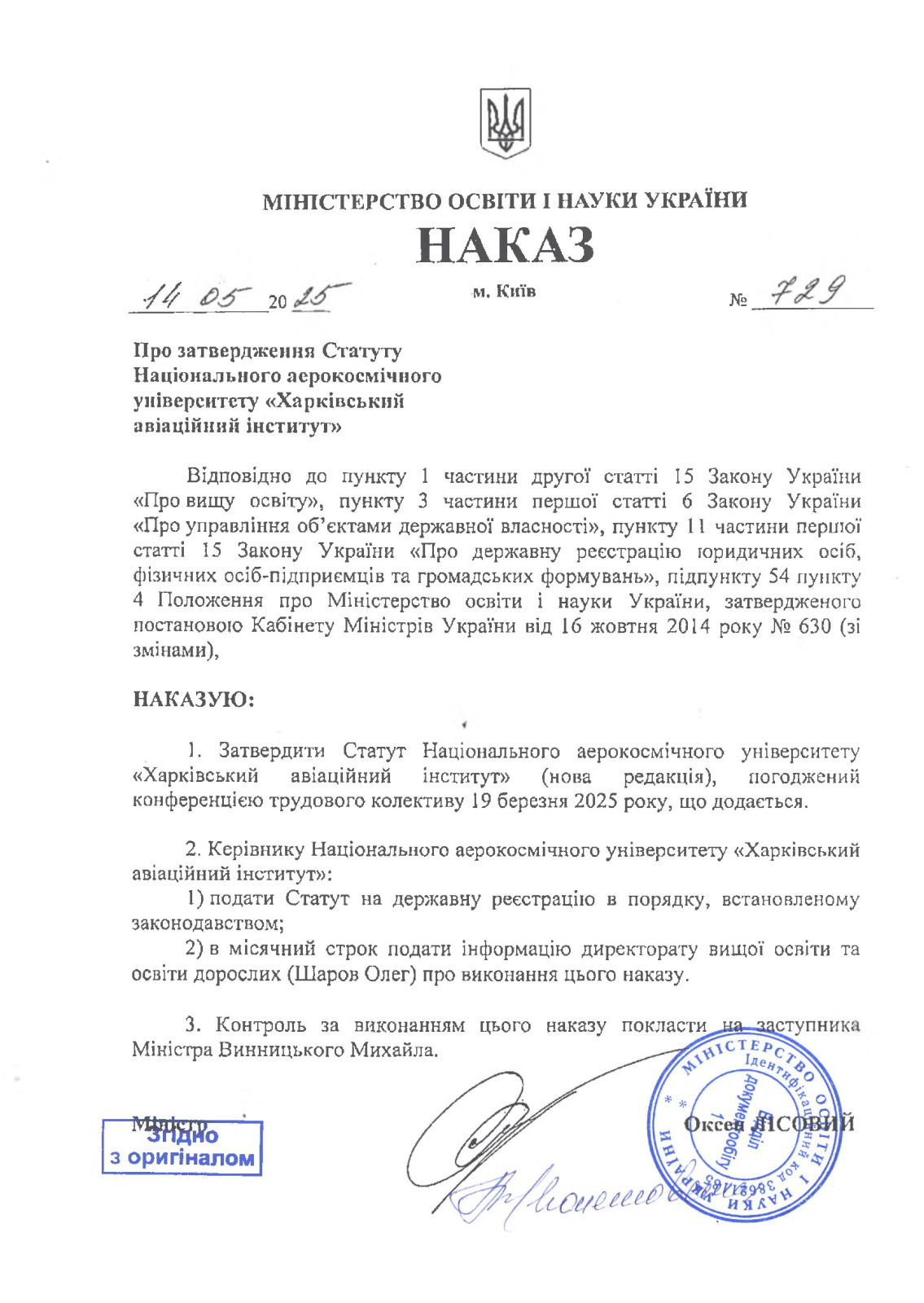 1.1. Цей Статут закладу вищої освіти розроблений відповідно до законодавства та є документом, що регламентує діяльність Національного аерокосмічного університету «Харківський авіаційний інститут» (далі – Університет).