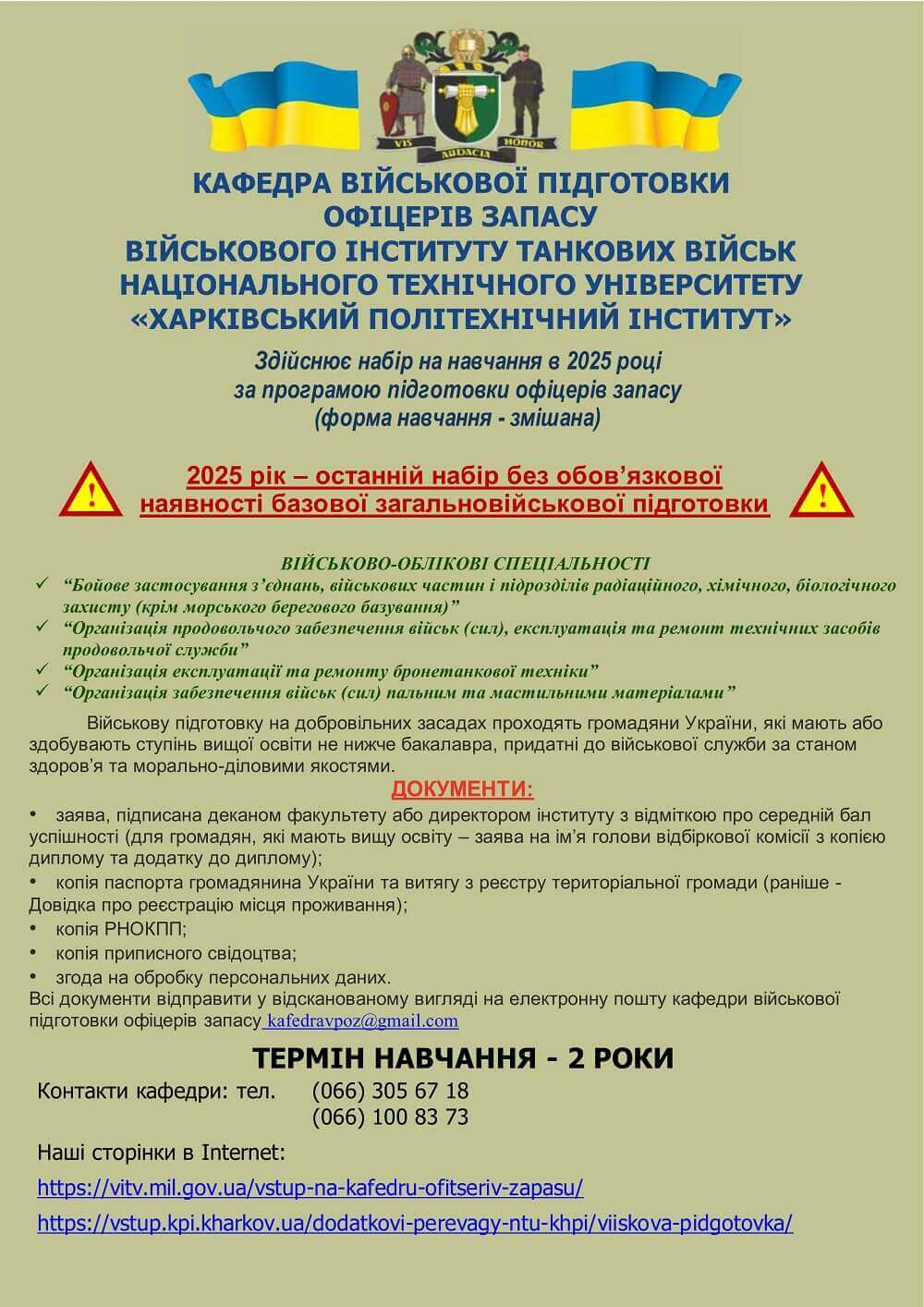 Кафедра військової підготовки офіцерів запасу Військового інституту танкових військ Національного технічного університету "Харківський політехнічний інститут" оголошує набір студентів на навчання у 2025 році.